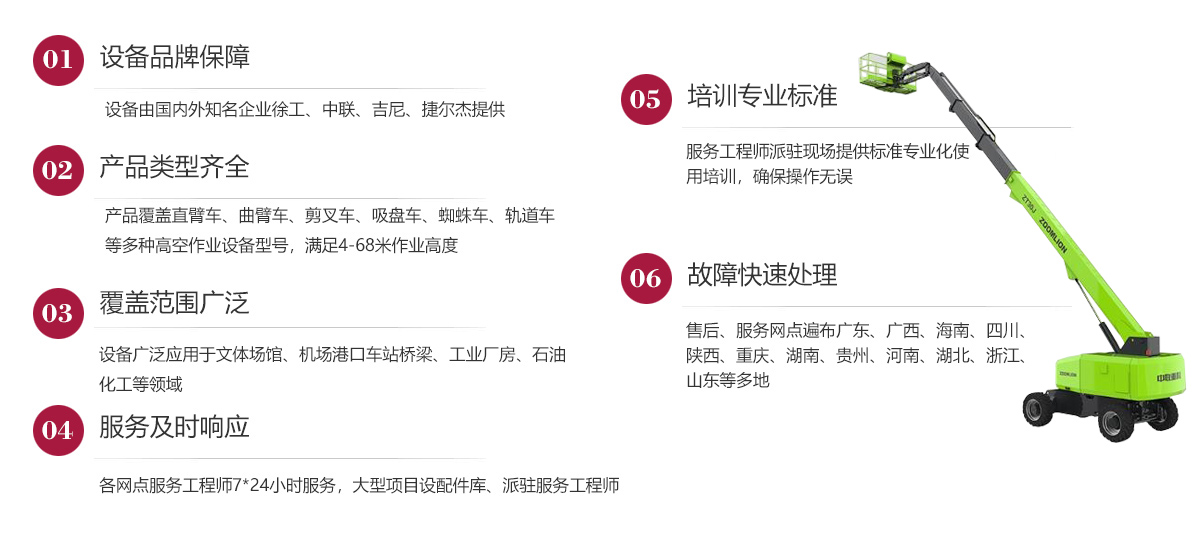 公司在發展歷程中堅定實行大客戶戰略,致力于以優質的服務打造公司的品牌和核心競爭力,現已在廣東、廣西、海南、四川、陜西、湖南、重慶、河南、湖北、貴州等多地建立了完善的售后服務網點,24小時為客戶排憂解難。今后我們將結合市場需求,不斷創新業務模式、優化設備結構、加強運營管理、擴大服務網點、提升服務水平,形成以設備租賃、銷售、二手設備交易等全方位一站式的全面服務體系,用高標準高質量的服務讓客戶在和公司合作的過程中實實在在感受到省心、省力、省錢的體驗,在客戶心目中樹立“家鋒”的品牌形象。